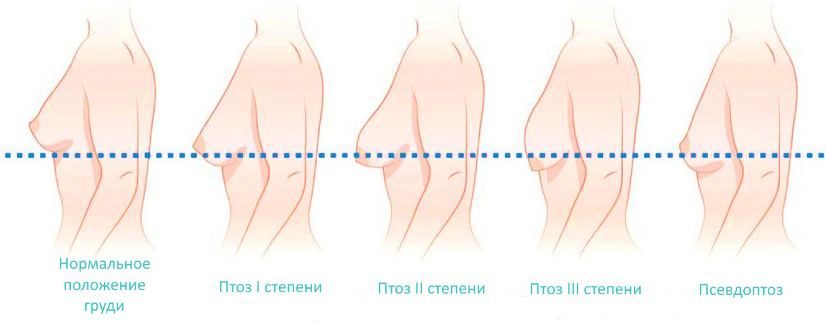 При классическом птозе объем груди и сосок опускаются ниже субмаммарной складки.