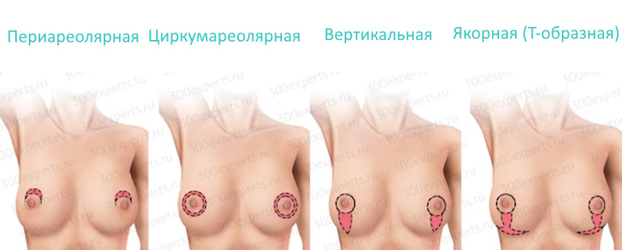 На сегодняшний день практикуется несколько методик подтяжки груди, применяемых в зависимости от вида и степени птоза, а также от изначального объема и положения ареолы и соска.