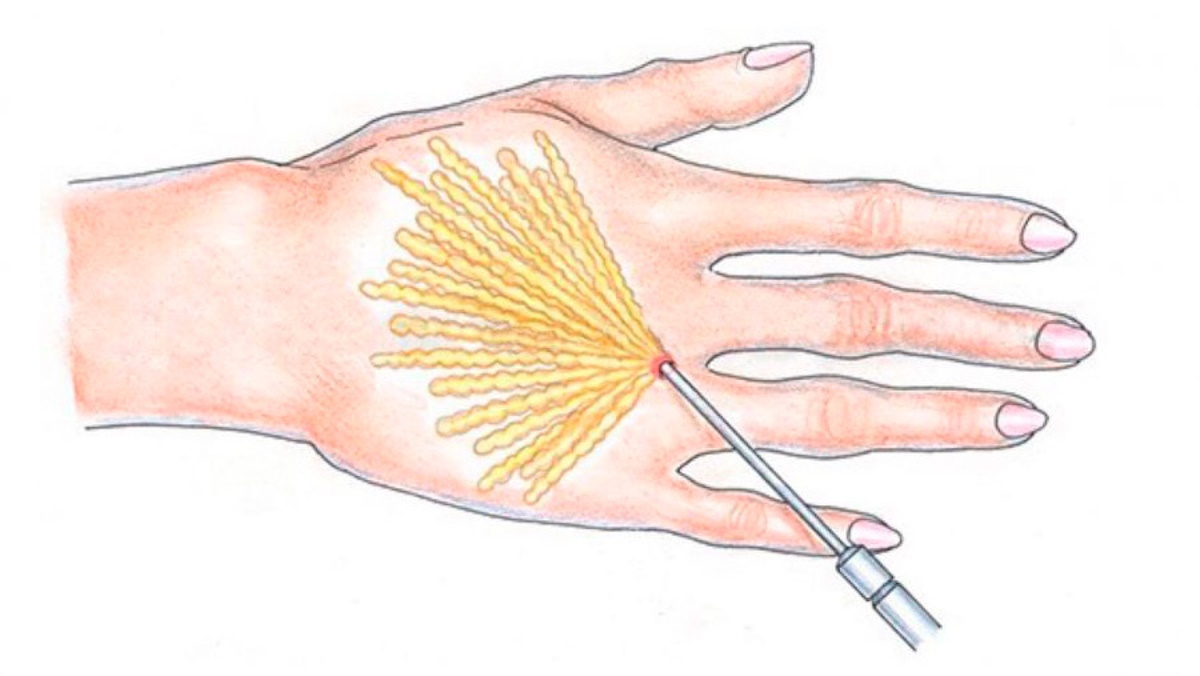 Процедура начинается с антисептической обработки рук и донорских зон. Затем пациенту вводится внутривенная седация, а на кожу наносится разметка. После этого в донорской области с помощью вакуумной липосакции хирург собирает жировые клетки. В стерильном контейнере или центрифуге клетки фильтруются и промываются. Специальным шприцем с тупой канюлей хирург, стараясь не травмировать сосуды, вводит очищенные жировые клетки в тыльную поверхность рук в соответствии с разметкой. Места проколов закрываются стерильными пластырями.