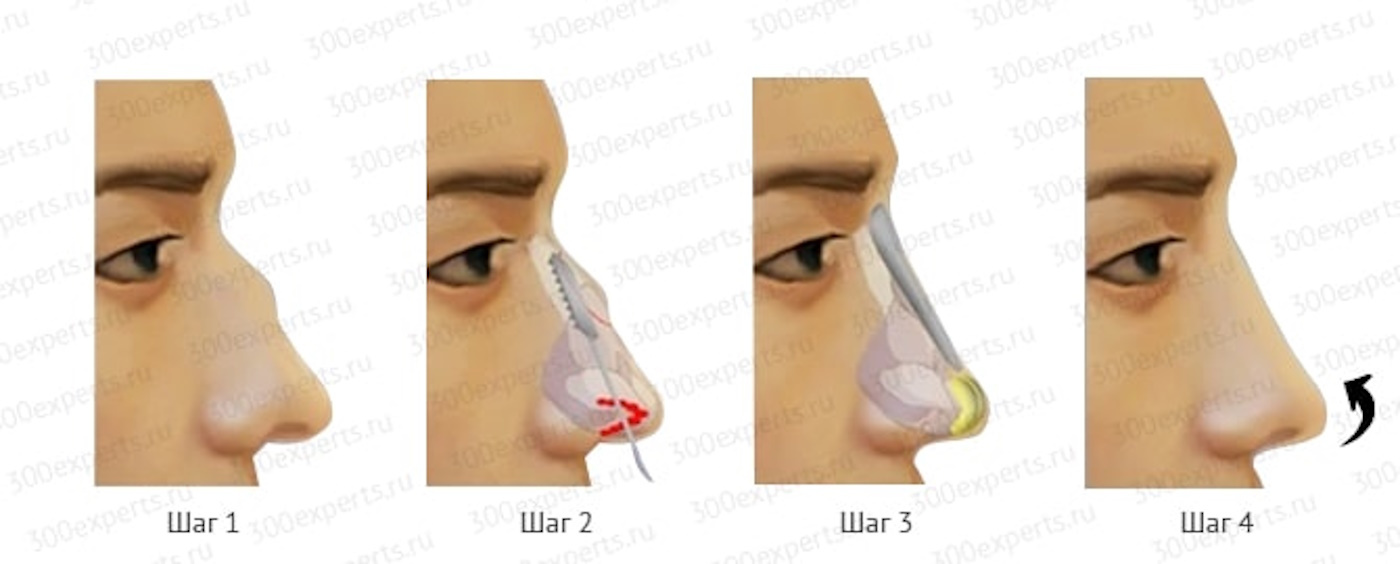 Для устранения горбинки носа этот тип применяется реже, так как разрез проходит по слизистой носа и не дает хирургу полного обзора.