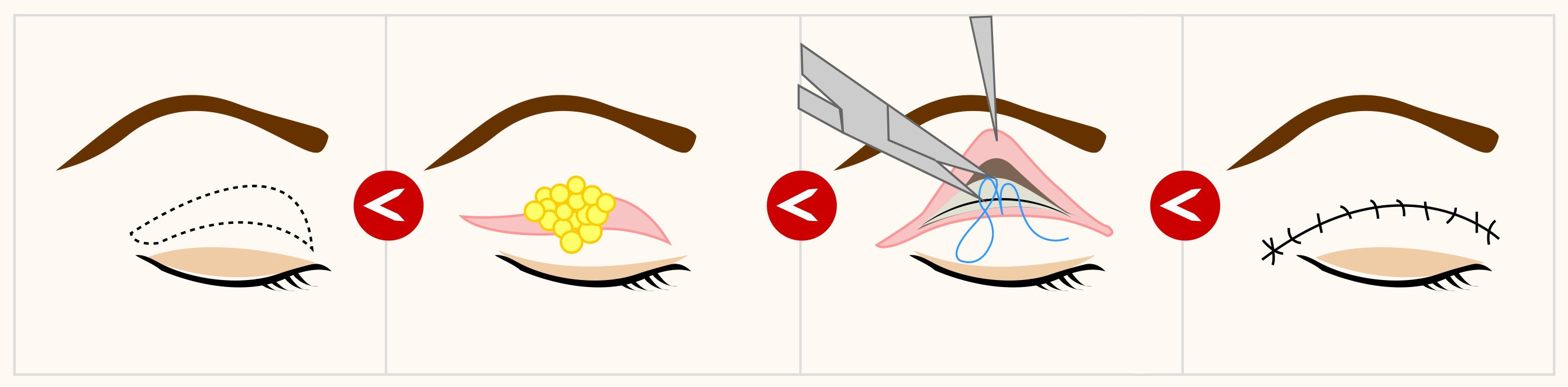 В зависимости от объема вмешательства и наличия аллергии у пациента операция на верхних веках проводится как под местной, так и под общей анестезией. Разметка наносится в сидячем положении — так определяется количество лишней кожи. Затем пластический хирург обрабатывает кожу и ограничивает операционное поле от окружающих тканей. После делается разрез вдоль естественной складки века, иссекается лишняя кожа и при необходимости жировые грыжи.