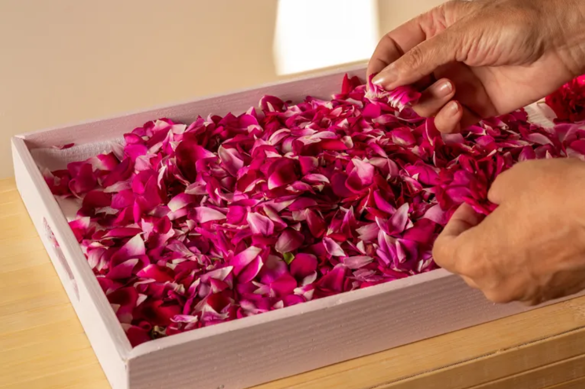 - Разомните одну столовую ложку масла шиповника с горстью свежих лепестков розы в небольшой миске.