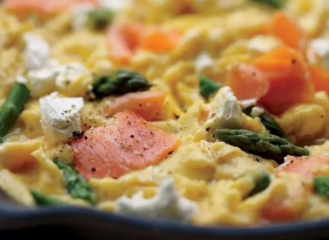 В яичницу можно добавлять практически все, что угодно, но почему бы не разнообразить ее и не попробовать более уникальные вкусовые сочетания? Чтобы получить полезные жиры, белок, а также мощные витамины и антиоксиданты, добавьте в свой следующий яичный завтрак немного лосося, спаржи и козьего сыра.