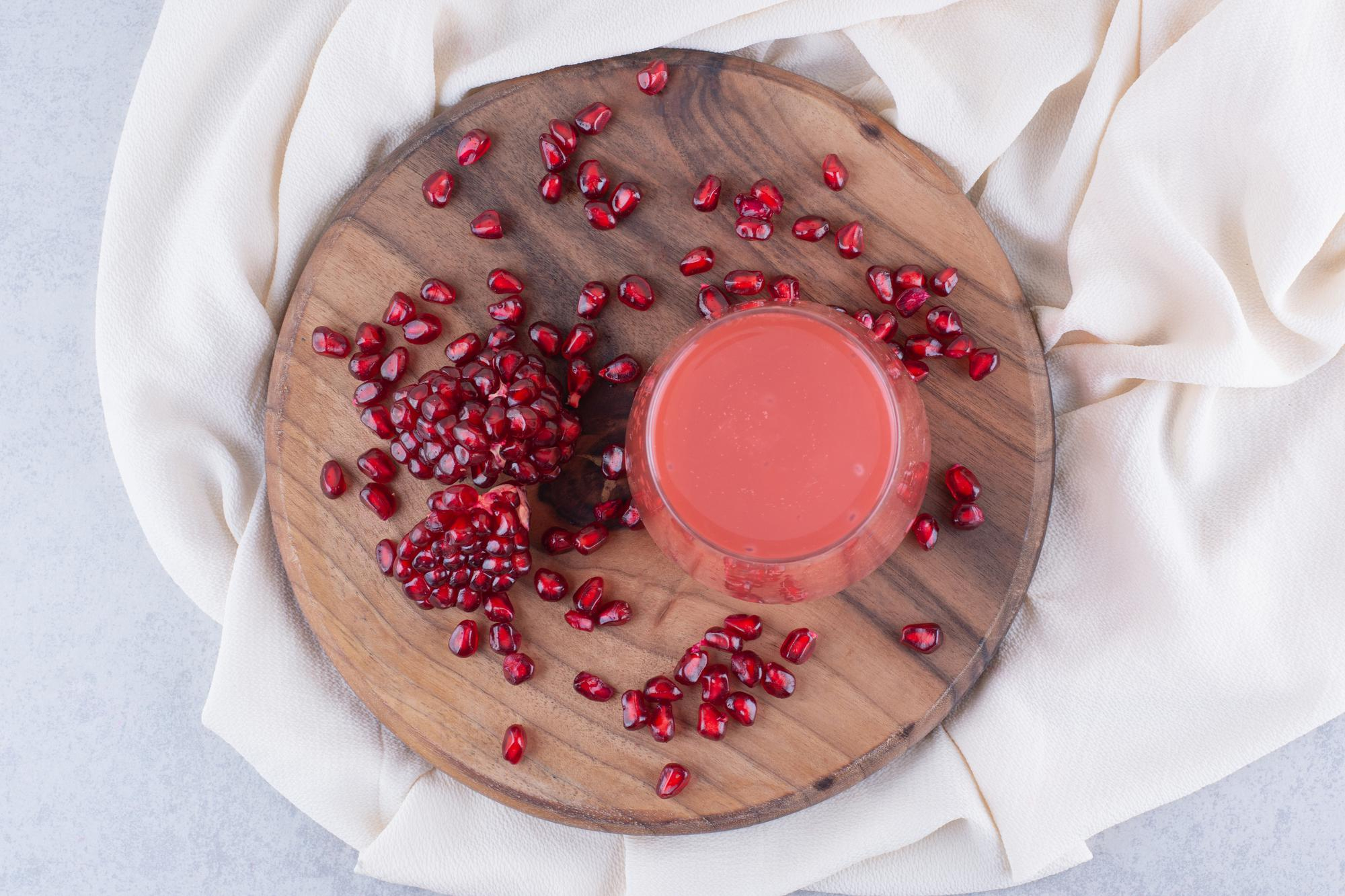 Гранат выделяется среди фруктов содержанием эллаговой кислоты — одного из наиболее мощных антиоксидантов против фотостарения. Напиток из гранатового сока с ягодами даёт насыщенный фруктовый вкус и оказывает выраженный омолаживающий эффект. Да, он улучшает плотность кожи, делает тон ровнее и защищает от последствий солнечного стресса. Для напитка можно смешать гранатовый сок со свежей клубникой и небольшим количеством льда.