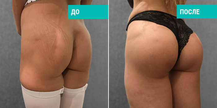 Также Дмитрий Викторович особое внимание уделяет процессу выделения ложа для импланта, что позволяет не только создать идеальные формы, но и при необходимости визуально расширить бедра.