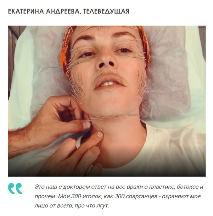 Конечно, эта процедура не могла остаться незамеченной среди селебрити. Среди адептов иглоукалывания Екатерина Андреева, Анджелина Джоли, Гвинет Пэлтроу, Дженнифер Энистон и многие другие.