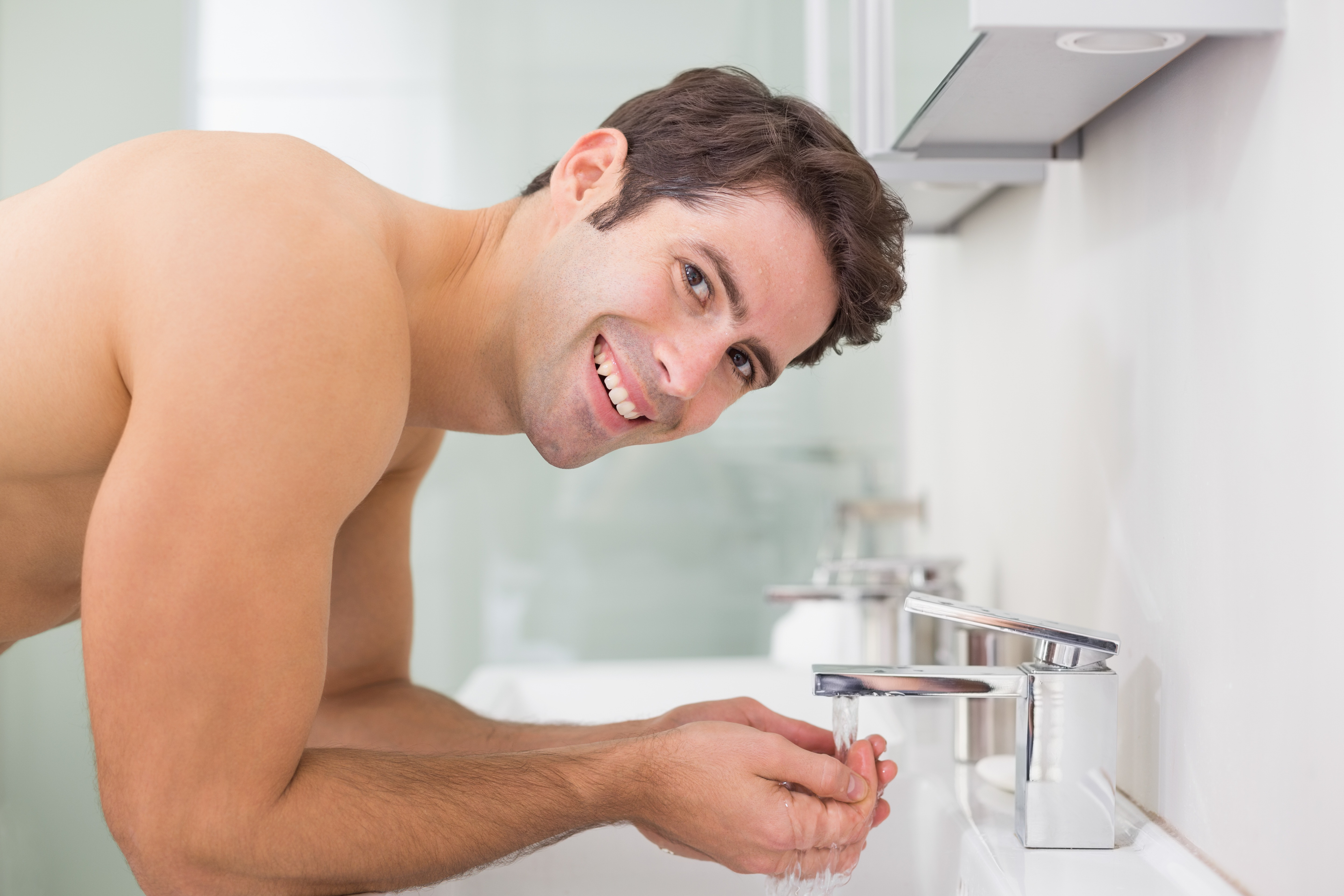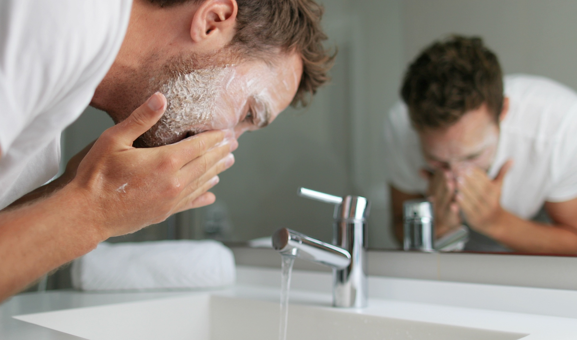 Эксперты рекомендует начинать процедуру ухода за кожей для мужчин с умывания лица мягким очищающим средством. Важно знать, что людям с более сухой или нормальной кожей не обязательно умывать лицо со средством по утрам. Если оставить натуральные масла, которые накапливаются на чистой коже на ночь, это поможет коже чувствовать себя менее сухой. Но на ночь должен умываться каждый. Важно удалить грязь, жир и другие загрязнения, которые накопились на коже в конце дня.