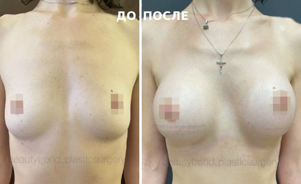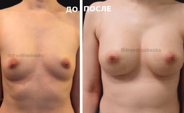 Фото пациентки пластического хирурга О. А. Андрющенко ДО и через 1 месяц ПОСЛЕ маммопластики с установкой имплантов