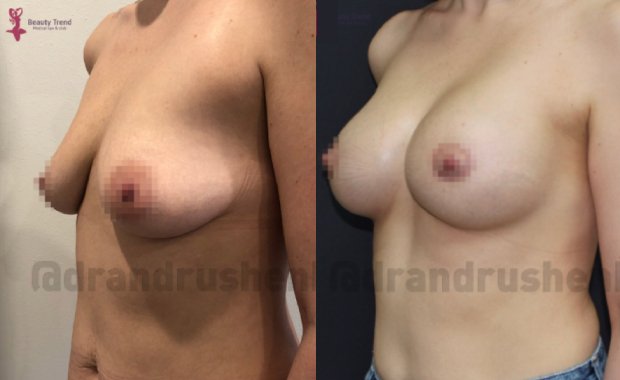 Фото пациентки пластического хирурга О. А. Андрющенко ДО и через 1,5 месяца ПОСЛЕ подтяжки груди с установкой имплантов