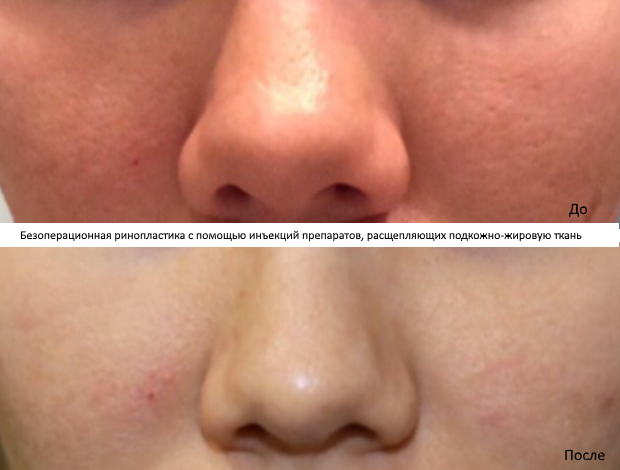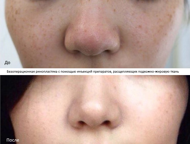 Коррекция кончика носа с помощью инъекций, размягчающих подкожно-жировую ткань, позволит избавиться от носа-картошки, сделать более изящными ноздри. В подкожно-жировую ткань вводится специальный препарат, который ее размягчает и «растворяет». Хирург руками «лепит» новый носик, а затем надевает фиксирующий пластырь. Через 4-5 дней доктор осматривает пациентку и снимает пластырь. Результат сохраняется навсегда. Это ювелирная работа! Большинство специалистов не берутся за такой метод гармонизации лица из-за рисков передозировки препарата и непредсказуемого мало ощутимого результата. Но в руках мастера все приобретает иной смысл. Многие люди не могут решиться на операцию, да и порой скорректировать хочется самую малость: сделать нос чуть изящнее, убрать горбинку, приподнять кончик, немного сузить ноздри. Для таких сомневающихся пациентов инъекции – настоящее спасение.