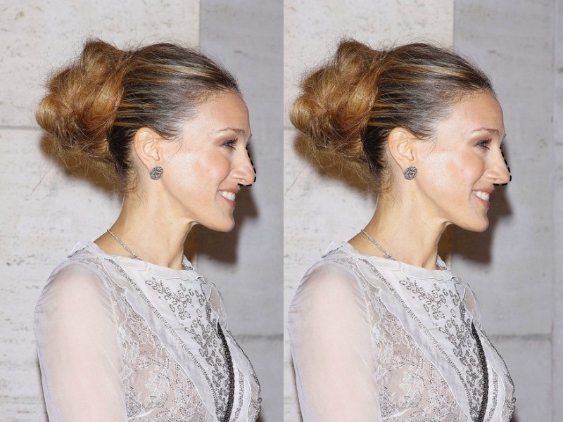 На примере Сары Джессики Паркер – яркой обладательницы «клюющего» носа – мы показали, как нити поднимают кончик и исправляют изъян.