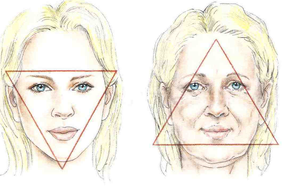 С возрастом из-за активности жевательных мышц и анатомических особенностей строения лица объем тканей уменьшается, а скулы опускаются. В результате кожа теряет эластичность и собирается в носогубных складках, образуются брыли, уголки губ опускаются, и человек начинает выглядеть уставшим и угрюмым. «Треугольник» как бы переворачивается вершиной вверх.