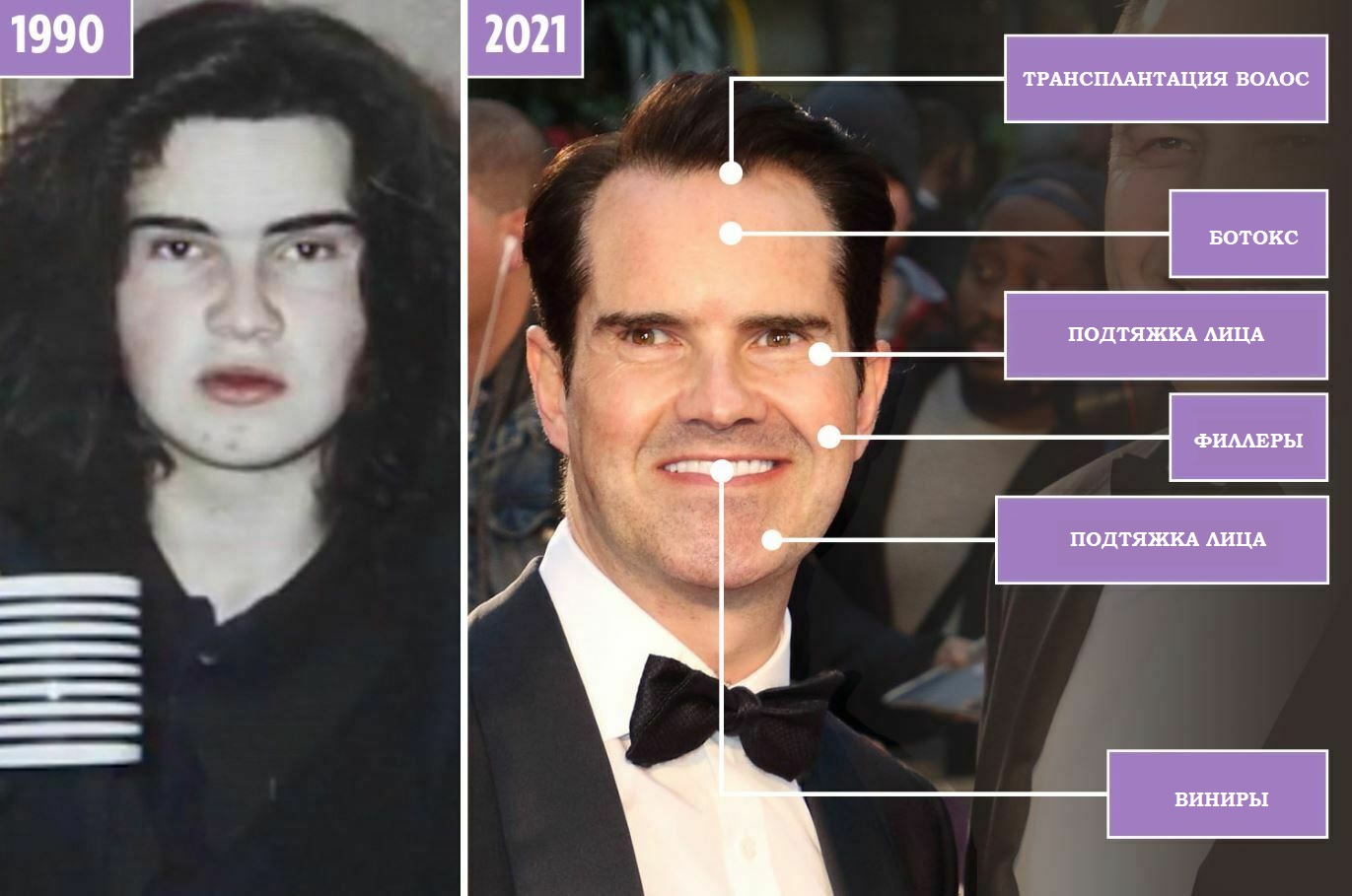 Ниже – мы подробнее рассмотрим более ранние и новые фотографии Джимми Карра, сравним их и обсудим различные процедуры, которые он, возможно, делал.