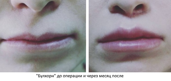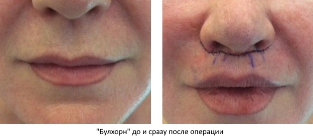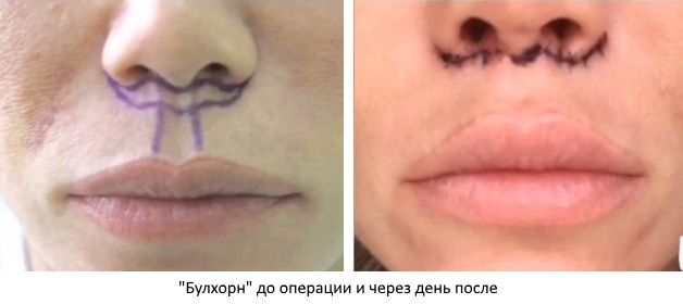 Необычное для слуха название техники «Булхорн» произошло от словосочетания bull’s horn – бычьи рога. Все дело в том, что врач удаляет над губами полоску кожи с тремя изгибами, по форме напоминающую рога быка. Суть этого действия заключается в сокращении расстояния между носом и губой и подтягивании красной каймы вверх. Верхняя губа приобретает объем и соблазнительную припухлость.