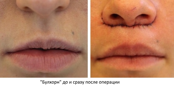 Существует две разновидности техники «Булхорн», и опытный врач обязательно определит оптимальный. Первый вариант предполагает иссечение кожи по краю верхней губы непосредственно над красной каймой. Этот способ подходит для пациенток с кожей, не склонной к образованию рубцов. Чтобы шрам выглядел более аккуратно и незаметно, кожа убирается в естественной складке под основанием носа. В таком случае губы поднимаются, а края удаленной кожи закрываются тонким швом. Если у пациентки есть тенденция к образованию видимых рубцов, врач использует «итальянский Булхорн», при котором делаются два разреза между ноздрями.
