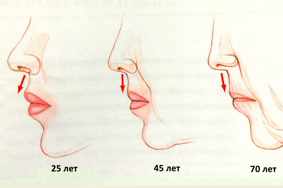 Лицо выглядит гармоничным и молодым, когда расстояние между основанием носа и верхней каймой губ составляет 12—15 мм. С возрастом или из-за анатомических особенностей кожа растягивается, а промежуток увеличивается. Губы подворачиваются, контуры становятся нечеткими, а уголки опускаются.