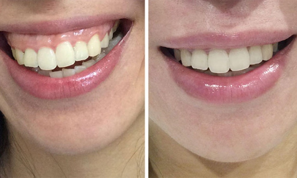 Иногда к десневой улыбке приводит слишком активная мимика и чрезмерная подвижность верхней губы. В этом случае коррекцию можно провести с помощью инъекций ботокса. При введении препаратов на основе ботулотоксинов мимические мышцы расслабляются, а ткани над верхней губой немного удлиняются. Как правило, этого становится достаточно, чтобы при разговоре или улыбке десна была прикрыта.