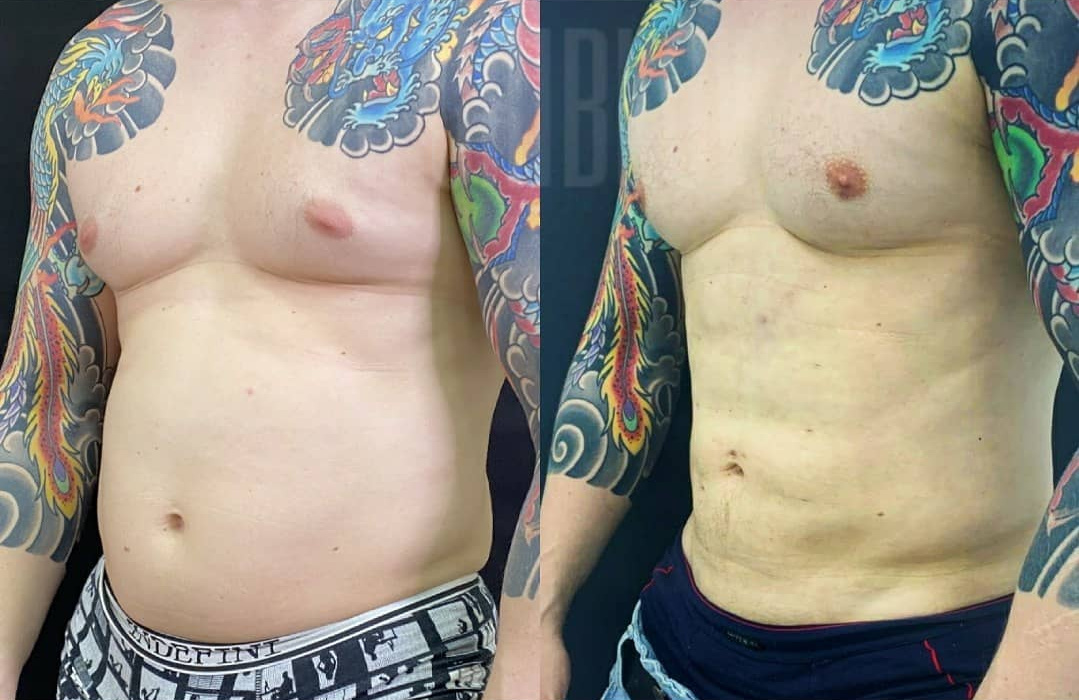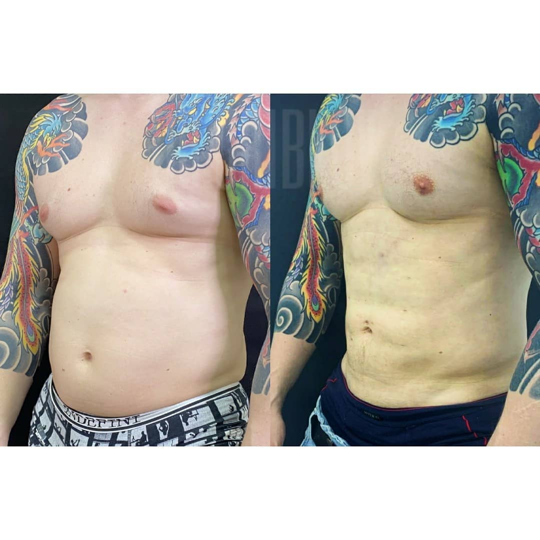 До и после липосакции с последующей прорисовкой мышечного рельефа собственным жиром. Пластический хирург В. П. Грибков