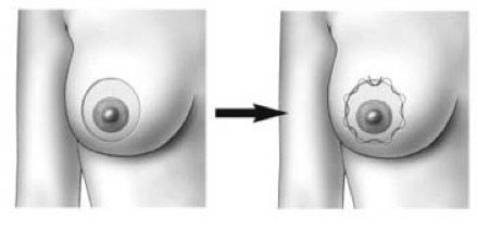 При незначительном птозе и псевдоптозе вернуть красивую подтянутую грудь поможет периареолярная подтяжка. Операция выполняется через разрез вокруг ареолы, но радиус рассечения не должен превышать 14 см.