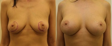На фото показан результат после циркулярной мастопексии, которая была совмещена с установкой грудных имплантов.