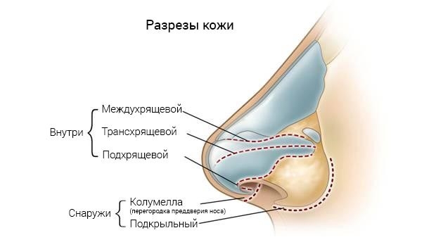 На фото изображены разрезы, которые делают во время операции на нос. Большинство из них выполняются внутри ноздрей во время закрытой ринопластики. Во время открытой ринопластики, которую в основном выполняют на кончике носа, делается небольшой надрез на перегородке, который позволяет хирургу увидеть хрящи и кости. После нее останется маленький незаметный шрам длиной в несколько миллиметров.