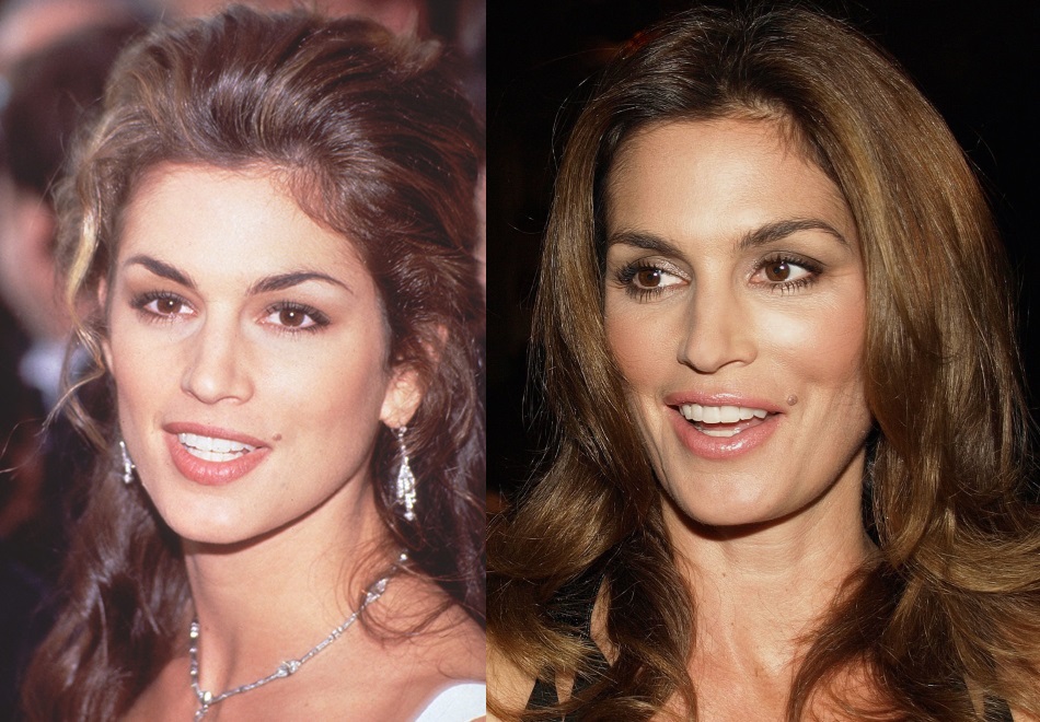 Введенные наполнители создают эффект «подушки» и расширяют скулы, придавая лицу форму треугольника. К счастью, Синди Кроуфорд знает меру и не теряет лицо, как Карла Бруни.