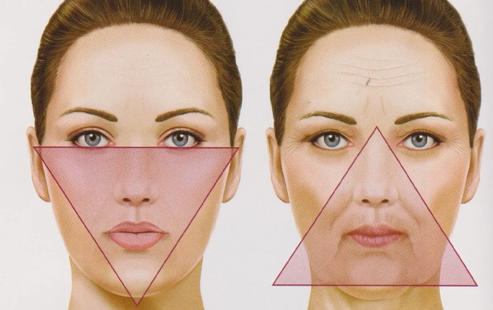 С возрастом кожа теряет эластичность, и мягкие ткани лица постепенно опускаются вниз, образуя носогубные складки, брыли и второй подбородок. Такое опущение и есть птоз. При нем лицо тоже напоминает треугольник, только уже с основанием в нижней трети лица. Как несложно догадаться, такой вид символизирует старость. К счастью, птоз не наступает в один момент. Он имеет разные стадии, на каждой из которых его можно убрать соответствующими методами.